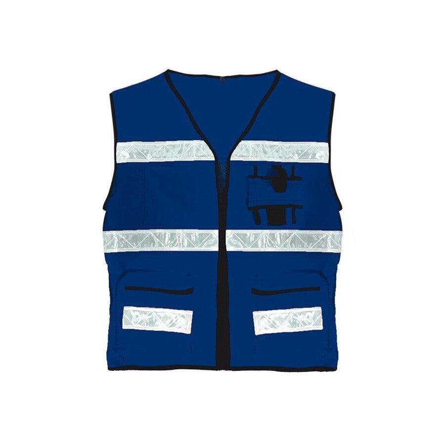 Chaleco reportero con malla en espalda 50% algodón, 50% poliéster, reflejante textil de 2, tres bolsas frontales y un porta radio. Colores: verde limón, azul marino, naranja. Tallas: ch - med - gde - xg - xxg.
